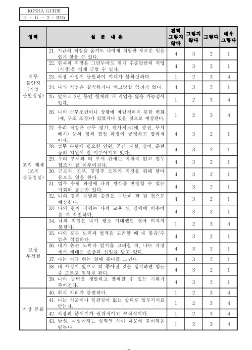 KOSHA GUIDE E-G-2-2025 직무스트레스로 인한 건강장해 예방 기술지원 규정에 ' 한국인 직무스트레스 요인 평가도구'가 첨부되어 있다. 기본형은 43문항으로 구성되어 있으며, 물리적환경, 직무요구, 직무자율, 관계갈등, 직무 불안정, 조직체계, 보상 부적절, 직장 문화 등 8개 하위영역으로 구성되어 있다'